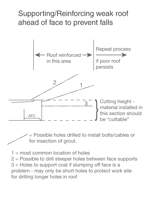 face with some form of roof bolting, using solid roof bolts or some form of flexible cable bolt, usually angled ahead of the face over