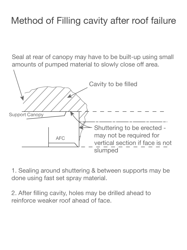 In the case of an empty cavity it may be possible simply to gain access above the supports and place timber chocks between the support canopies and roof to allow advance to continue. In this case support of the cavity roof is minimal and the main function of the timber is to provide material for the hydraulic face supports to bear against, sufficiently stable to resist the reaction force from adjacent supports or the AFC being moved forward. While this process is simple and relatively cheap, there is a strong possibility that the cavity will continue to extend as the face advances. Placing timber above the supports can be a hazardous exercise, possibly entailing too great a risk for it to be viable.