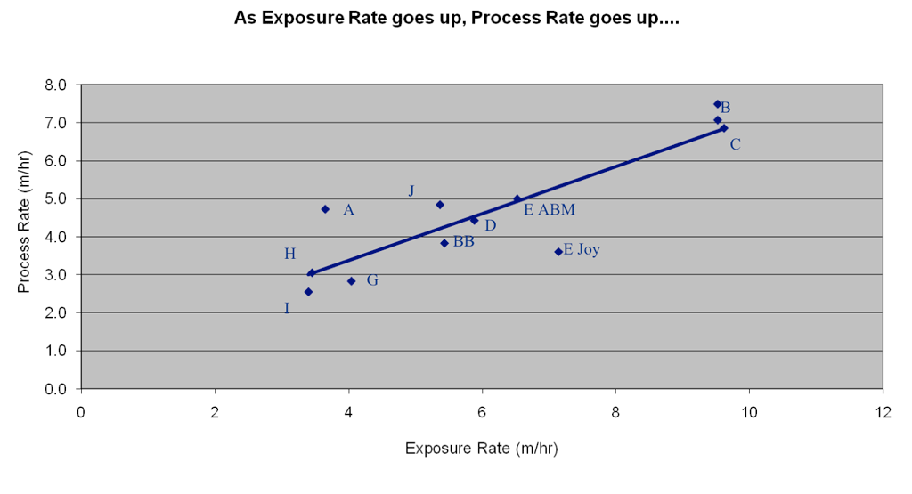 It was evident from the study that big breaker feeders and big fast shuttle cars push the exposure rate up, and that Joy 12CM12 miners cut faster than Sandvik ABM25 miners resulting in increased rates. Conversely, limiting the discharge rate through the breaker feeder slows the rate, while a failure to utilise hungry boards on a shuttle car at one mine resulted in a 10% lower exposure rate.