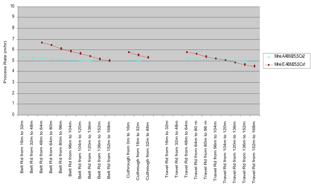 To further evaluate the effect of equipment and capacity on process rate comparable support densities and exposure rates were evaluated against mines utilising similar continuous miners. It was again noted that there were significant variations in process rates for miner-bolters, as shown in Figure 10.
